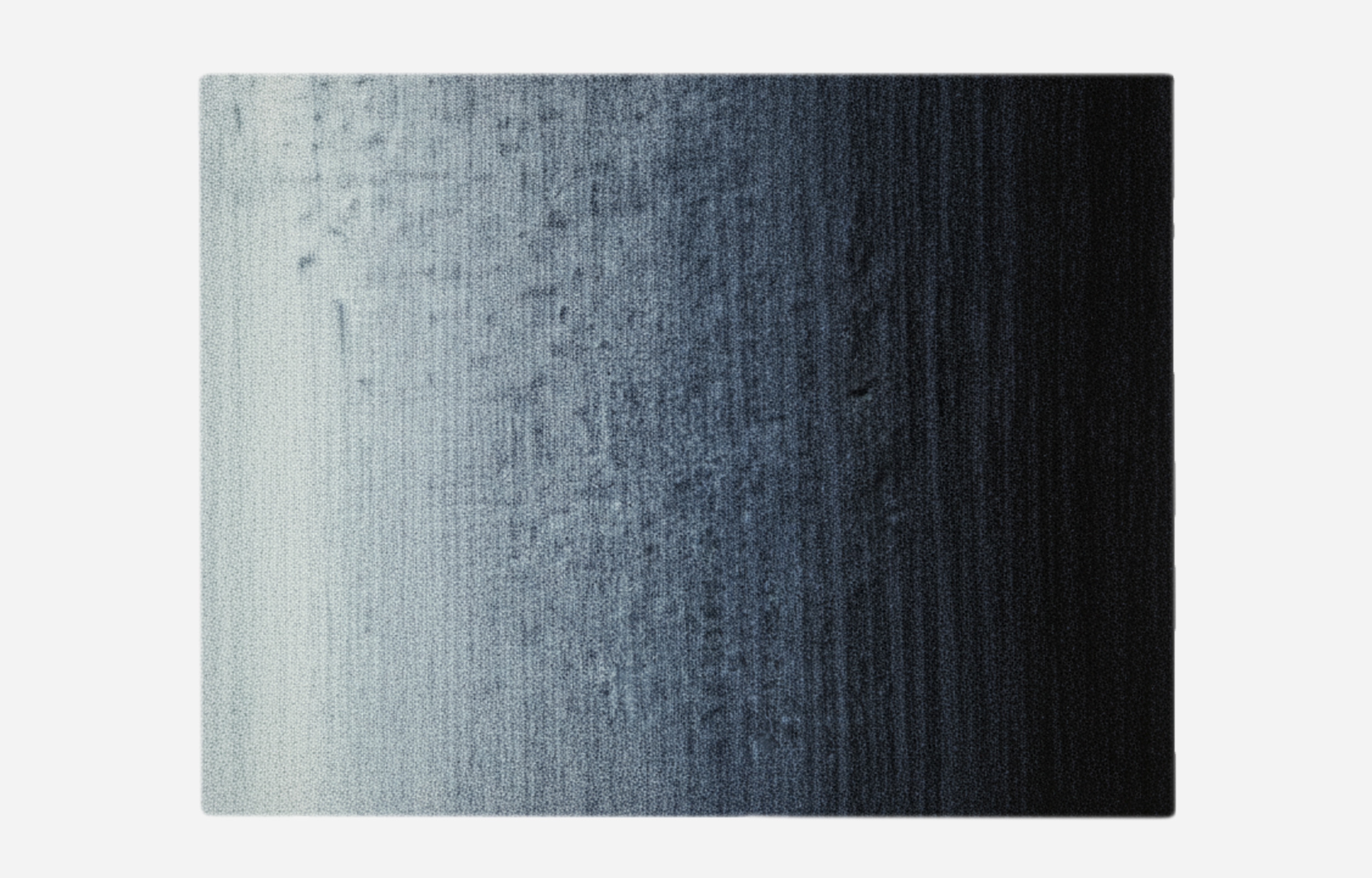 The CHROMA DECAY rug executes a profound, manually dyed directional ombre fade, starting from a state of near-zero Kelvin and progressing into the absolute void of deep, saturating Noir Profond. The artisanal process renders each rug unique and unrepeatable.